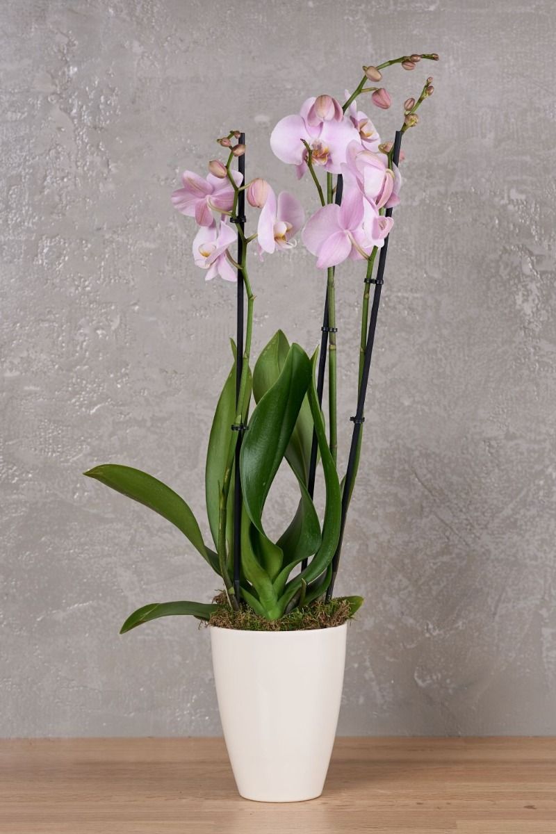 Μια ορχιδέα σε ροζ απαλό χρώμα σε συνδυασμό με λευκό κασπώ. Διαστάσεις: Ύψος: 70cm / Διάμετρος: 13cm.
