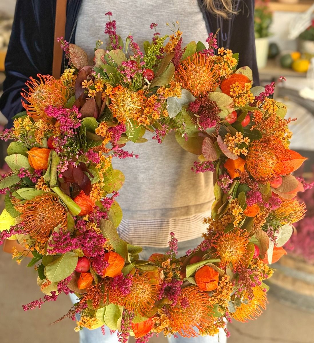 Ένα στεφάνι από φρέσκα λουλούδια και φθινοπωρινά φυλλώματα. Διάμετρος: 50cm