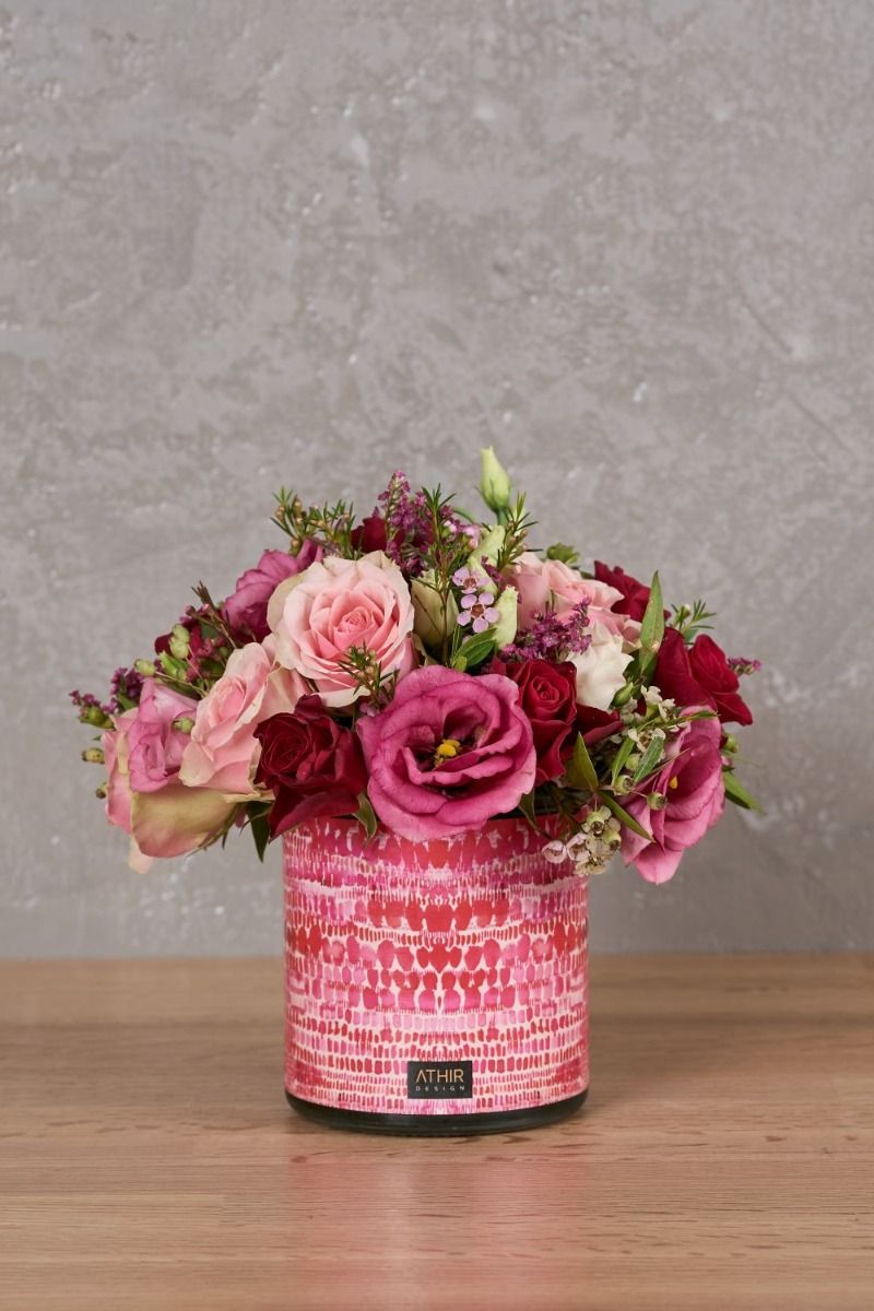 Εντυπωσιακή, μοντέρνα αλλά και τρυφερή σύνθεση με τριαντάφυλλα, πρασινάδες και λουλούδια εποχής σε αποχρώσεις του κόκκινου και του ροζ. Μια γλυκιά έκπληξη περιμένει τον παραλήπτη του. Ύψος 22cm / Διάμετρος 15cm.