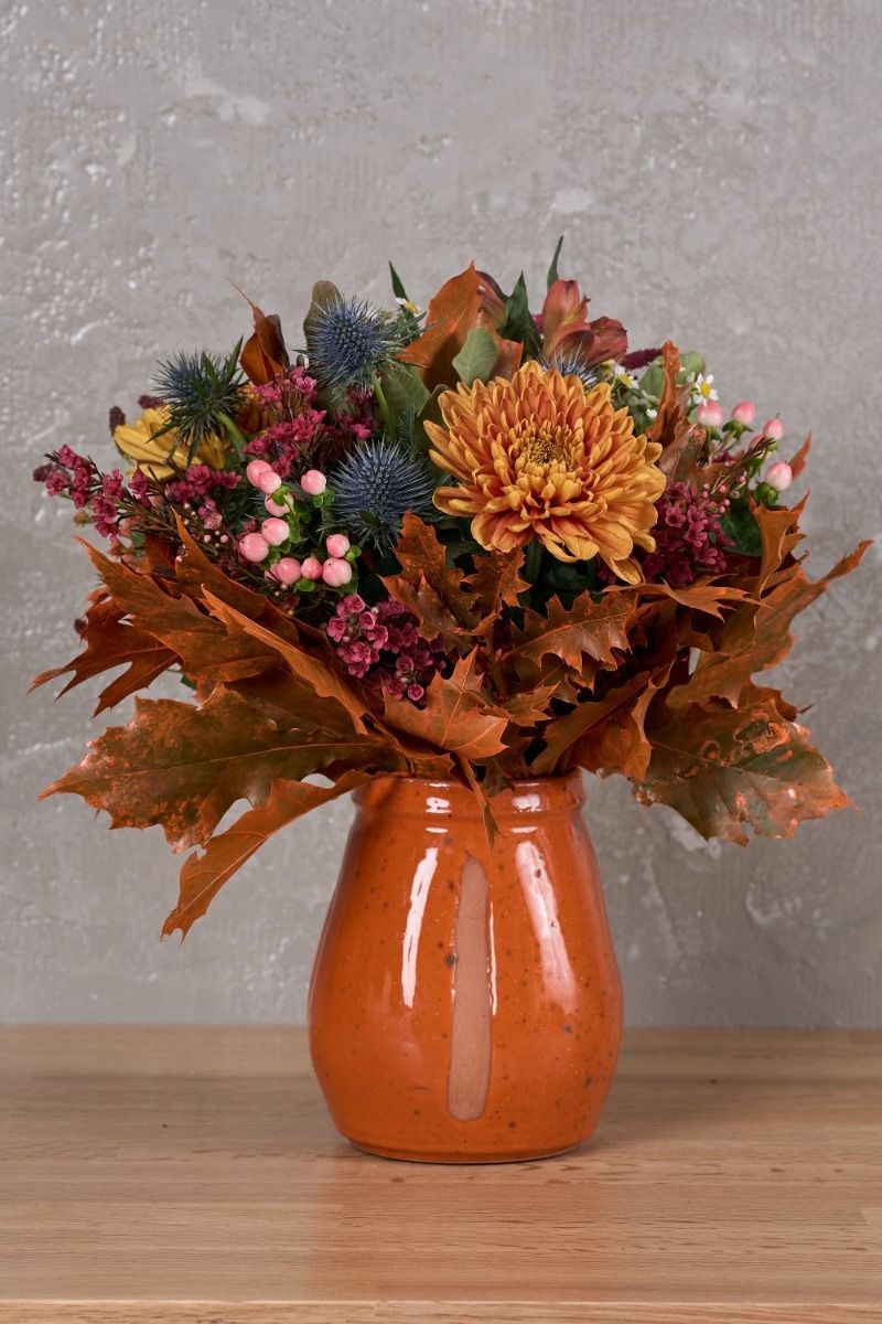 Η μαγεία του φθινοπώρου σε ένα χειροποίητο κεραμικό βάζο, με τα χρυσάνθεμα, το wax flower και τα φυλλώματα querqus να δημιουργούν την ιδανική ατμόσφαιρα για την εποχή. Ύψος: 40cm / Πλάτος 30cm.
