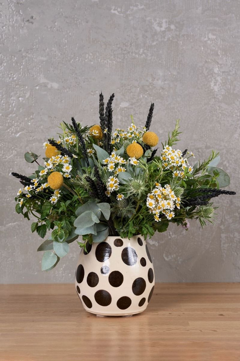 Ένα χειροποίητο και κομψό βάζο με μαύρες πουα λεπτομέρειες είναι ιδανικό για να φωτίσει κάθε μεριά του σπιτιού σας. Περιέχει χαμομήλι, κρασπέντιες, εριγκιουμ, μαύρα αποξηραμένα στάχια και ευκάλυπτο. Διαστάσεις: Ύψος: 45cm / Διάμετρος 35cm.