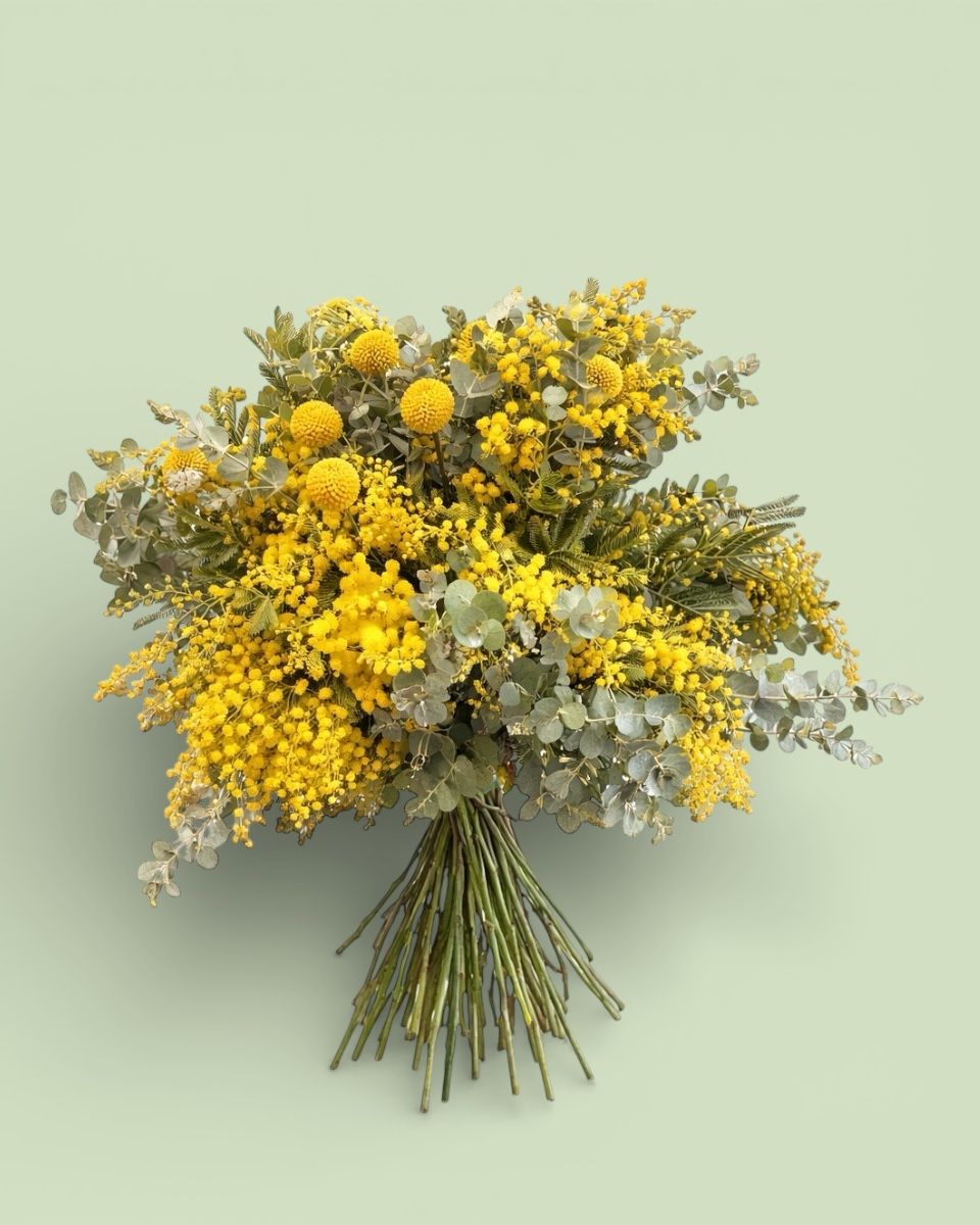 Ένα υπέροχο κίτρινο μπουκέτο με μιμόζα, κρασπέντια και ευκάλυπτο. Ύψος: 60cm / Διάμετρος: 45cm.
