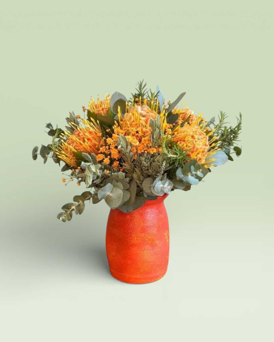 Μια πορτοκαλί σύνθεση με βάση τα ιδαίτερα άνθη νιούτον σε χειροποίητο κεραμικό βάζο