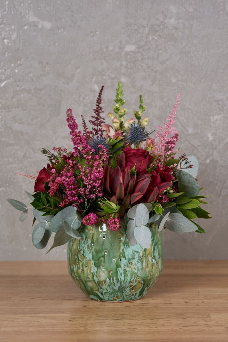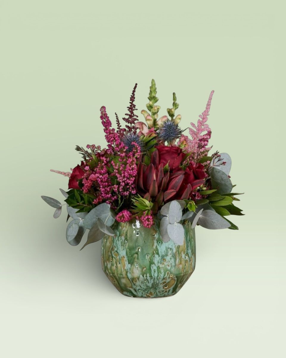 Μια μαγευτική σύνθεση εμπνευσμένη από τα βαθιά χρώματα του φθινοπώρου σε ένα κεραμικό κασπώ σε γιήνους πράσινους τόνους με κόκκινα τριαντάφυλλα, λευκόδεντρο, ερίγκιουμ, σκυλάκια, αστίλβη, έρικα και διάφορες πρασινάδες. Διαστάσεις: Ύψος: 35cm / Διάμετρος: 28cm