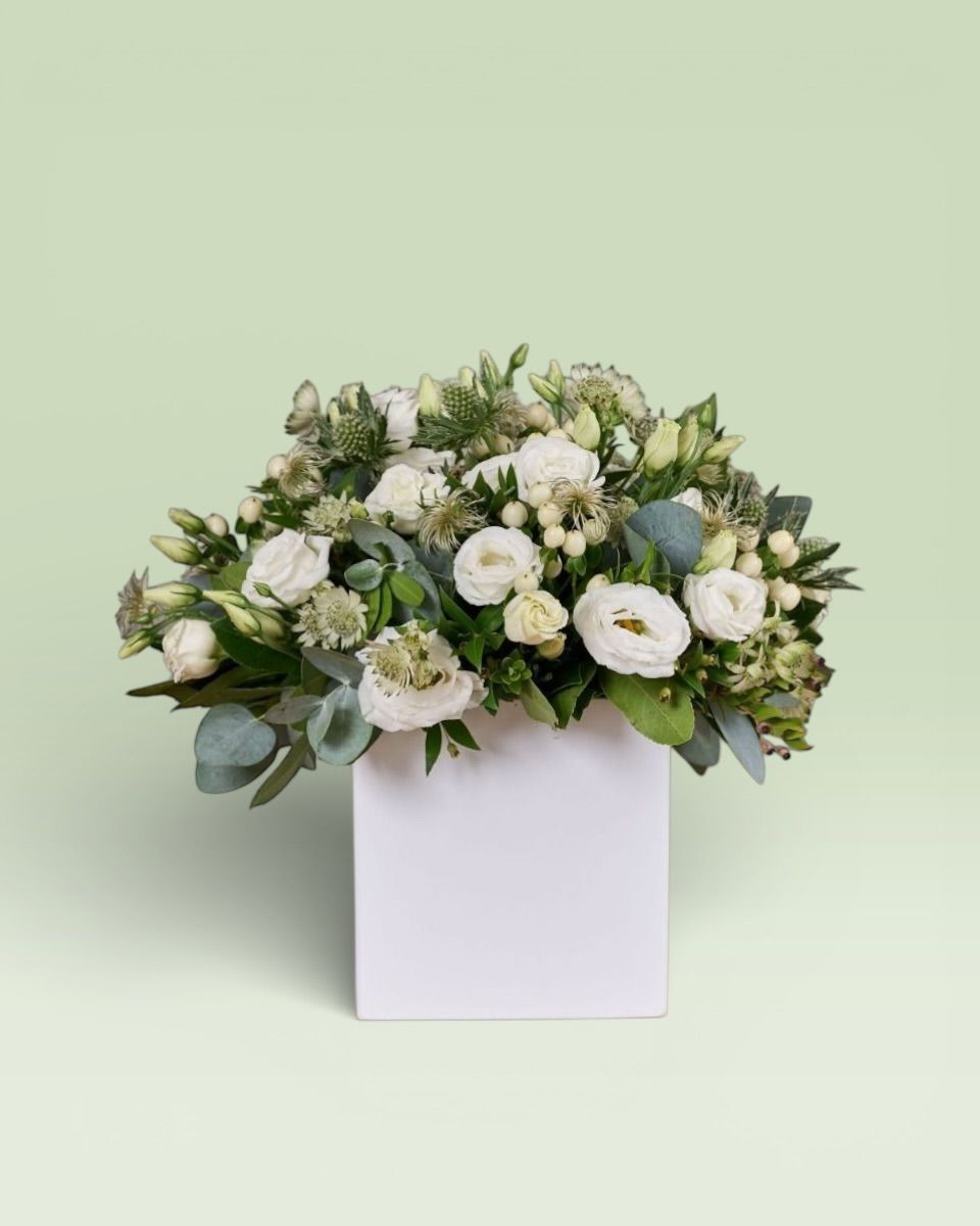 Μια ολόλευκη σύνθεση σε κασπώ σε σχήμα κύβου ιδανική για κάθε περίσταση. Το λευκό χρώμα συμβολίζει την αρμονία και την απλότητα.