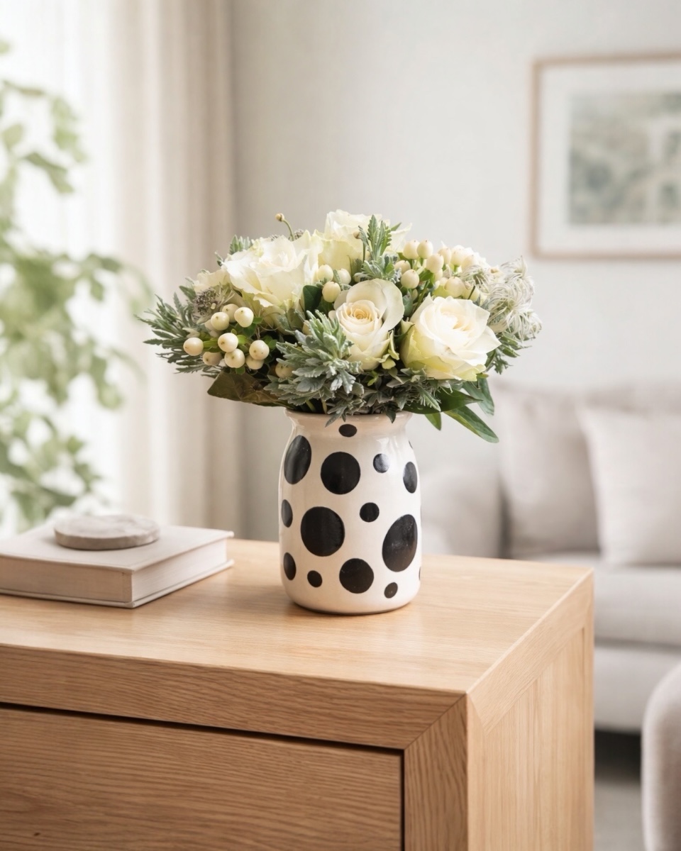 Λευκά τριαντάφυλλα, υπέρικουμ και αστράντια με αρωματικές πρασινάδες, ένας απλός και κομψός συνδυασμός, σε ασπρόμαυρο χειροποίητο κεραμικό βάζο. Το λευκό χρώμα συμβολίζει την αγνότητα και την αρμονία, ενώ το μαύρο την κομψότητα και το μυστήριο.