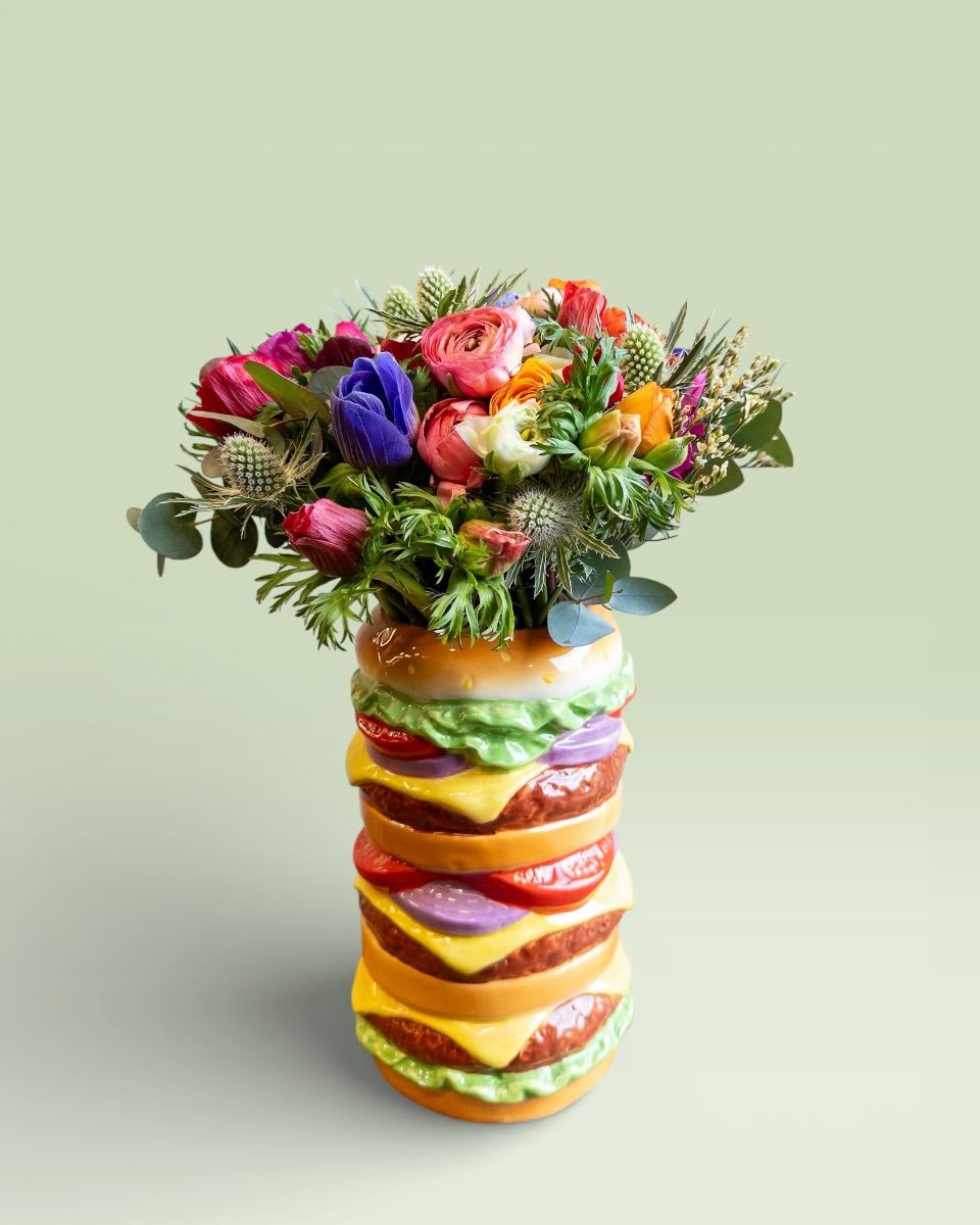 Μια υπέροχη σύνθεση με πολύχρωμες, ανοιξιάτικες νεραγκούλες και ανεμώνες σε ένα μονάδικο βάζο – burger!