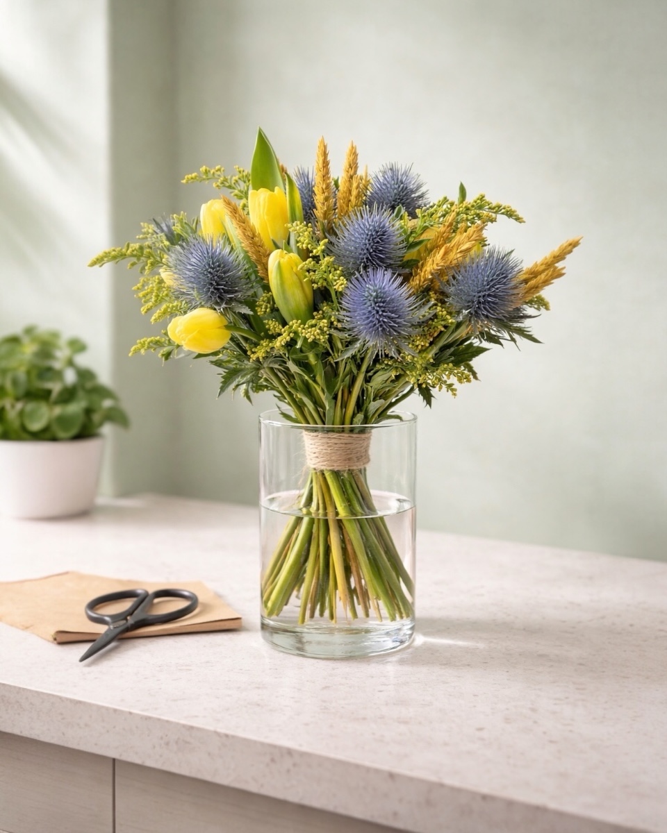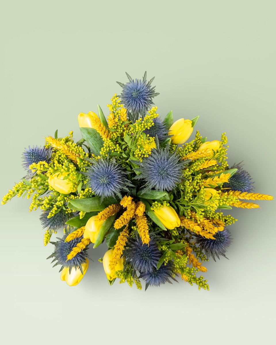 Ένα πανέμορφο μπουκέτο με κίτρινες τουλίπες, μπλε ερύγκιουμ και κίτρινα αποξηραμένα στάχυα.