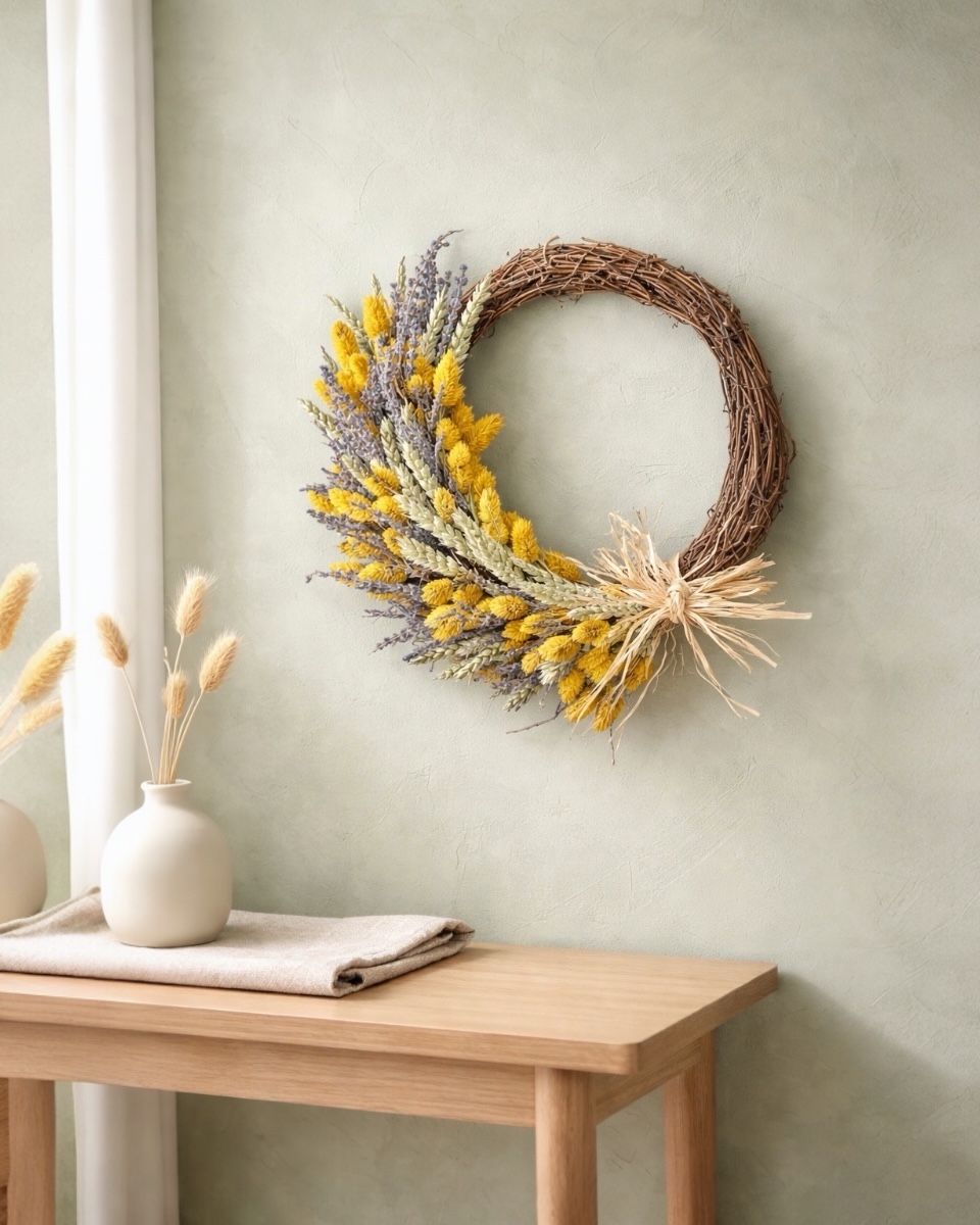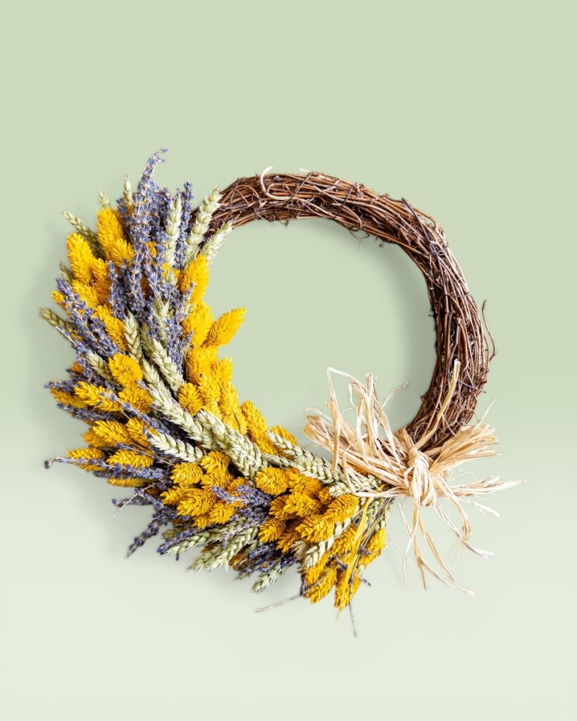 Στεφάνι σε γηίνους τόνους, αποξηραμένα φυσικά στάχυα, λεβάντα και κίτρινα φάλαρις, ιδανικό για την πόρτα ή τον τοίχο που χαρίζει ζεστή ατμόσφαιρα στον χώρο.