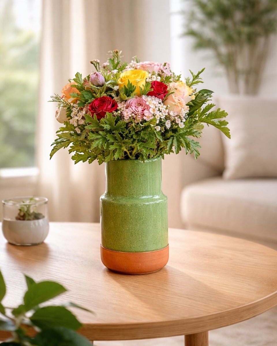 Springtime Bloom, μια πολύχρωμη σύνθεση με ποικιλία λουλουδιών και αρωματικά σε χειροποίητο κεραμικό βάζο. Εμπνευσμένη από την άνοιξη, γεμάτη φρεσκάδα και ζωντάνια. Ιδανική για να φωτίσει κάθε χώρο και να χαρίσει θετική διάθεση.