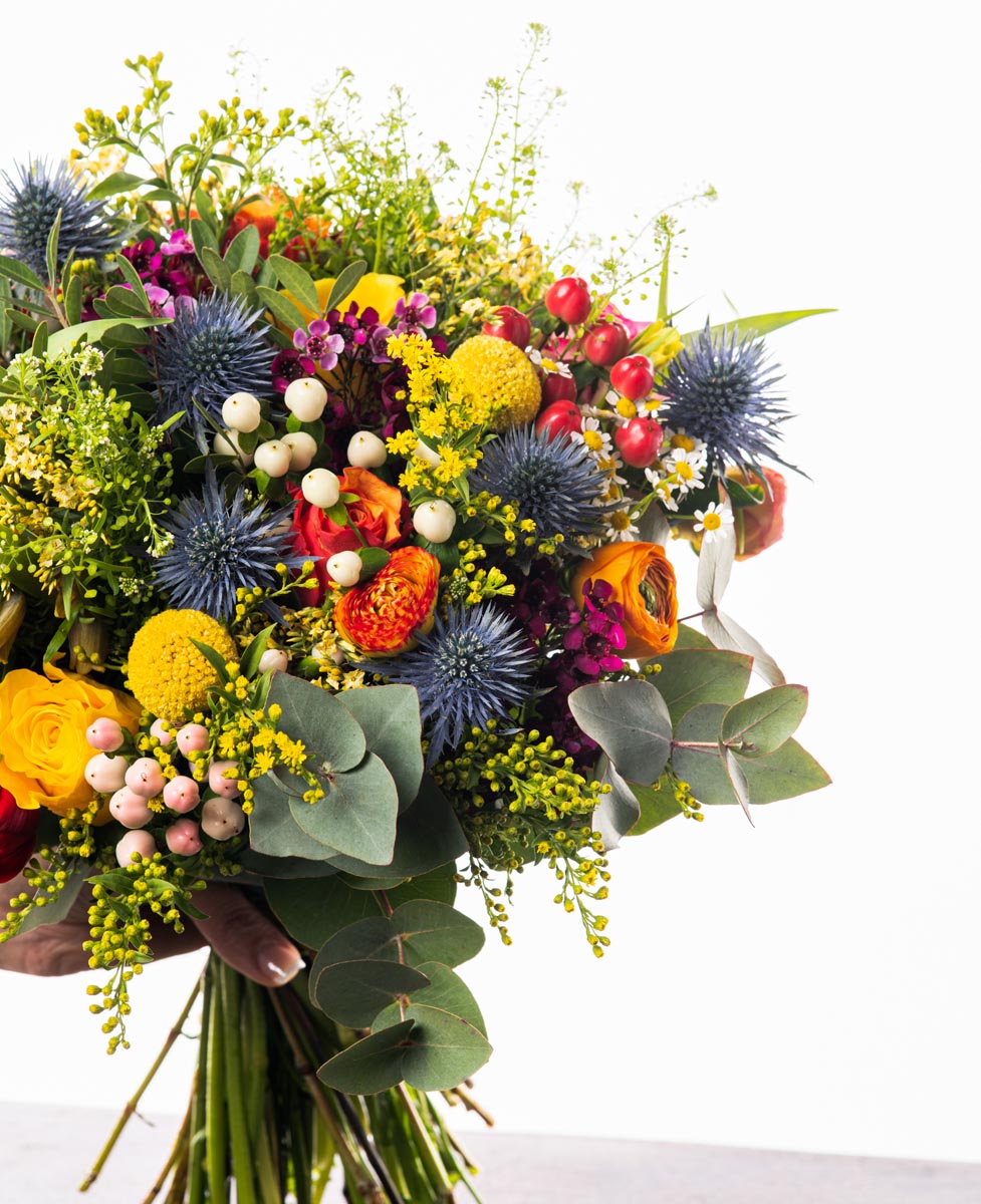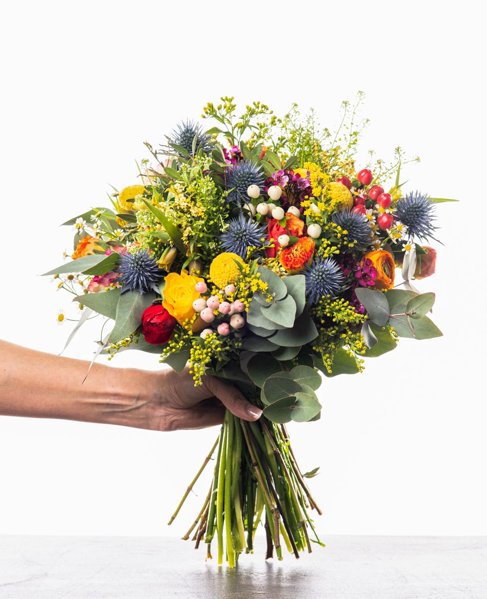 Ένα πολύχρωμο και χαρούμενο μπουκέτο έτοιμο να διακοσμήσει το βάζο σας ! Λουλούδια εποχής, λουλούδια του αγρού, πρασινάδες και διάφορα είδη καρπών.