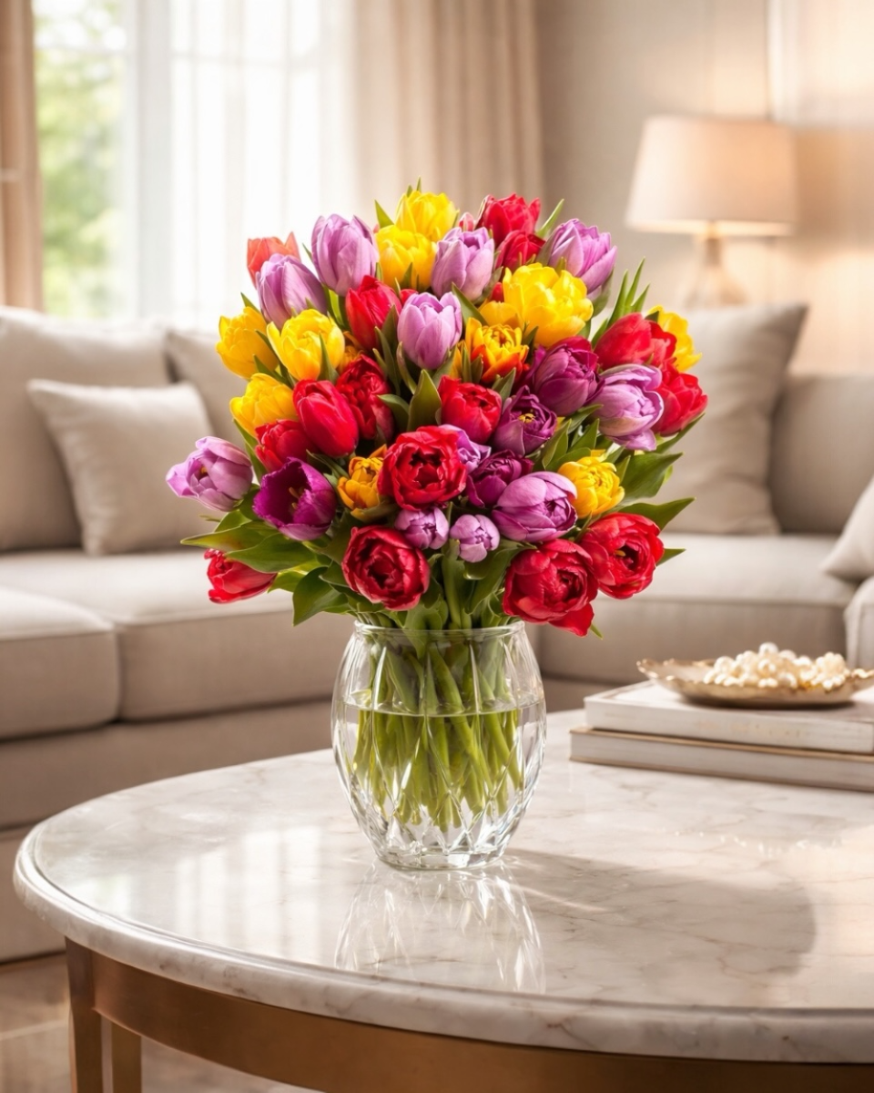 Για μεγαλύτερη διάρκεια ζωής των λουλουδιών, συνιστούμε να κόβετε λοξά τα κοτσάνια ακριβώς πριν τα τοποθετήσετε σε καθαρό βάζο γεμάτο με φρέσκο νερό (τουλάχιστον μέχρι τη μέση). Αλλάζετε το νερό κάθε 1–2 ημέρες και διατηρείτε το μπουκέτο σε δροσερό σημείο, μακριά από άμεσο ήλιο και πηγές θερμότητας. Προαιρετικά, μπορείτε να προσθέσετε στο νερό μια σταγόνα χλωρίνης ή ξύδι για καλύτερη διατήρηση.