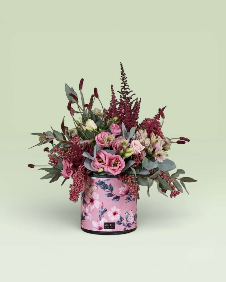 Μία ”pink martini” επιλογή έτοιμη να την πιεις στο ποτήρι! Συνδυασμός από λουλούδια εποχής σε ροζ, φούξια αποχρώσεις. Ύψος: 38 cm / Διάμετρος: 28 cm