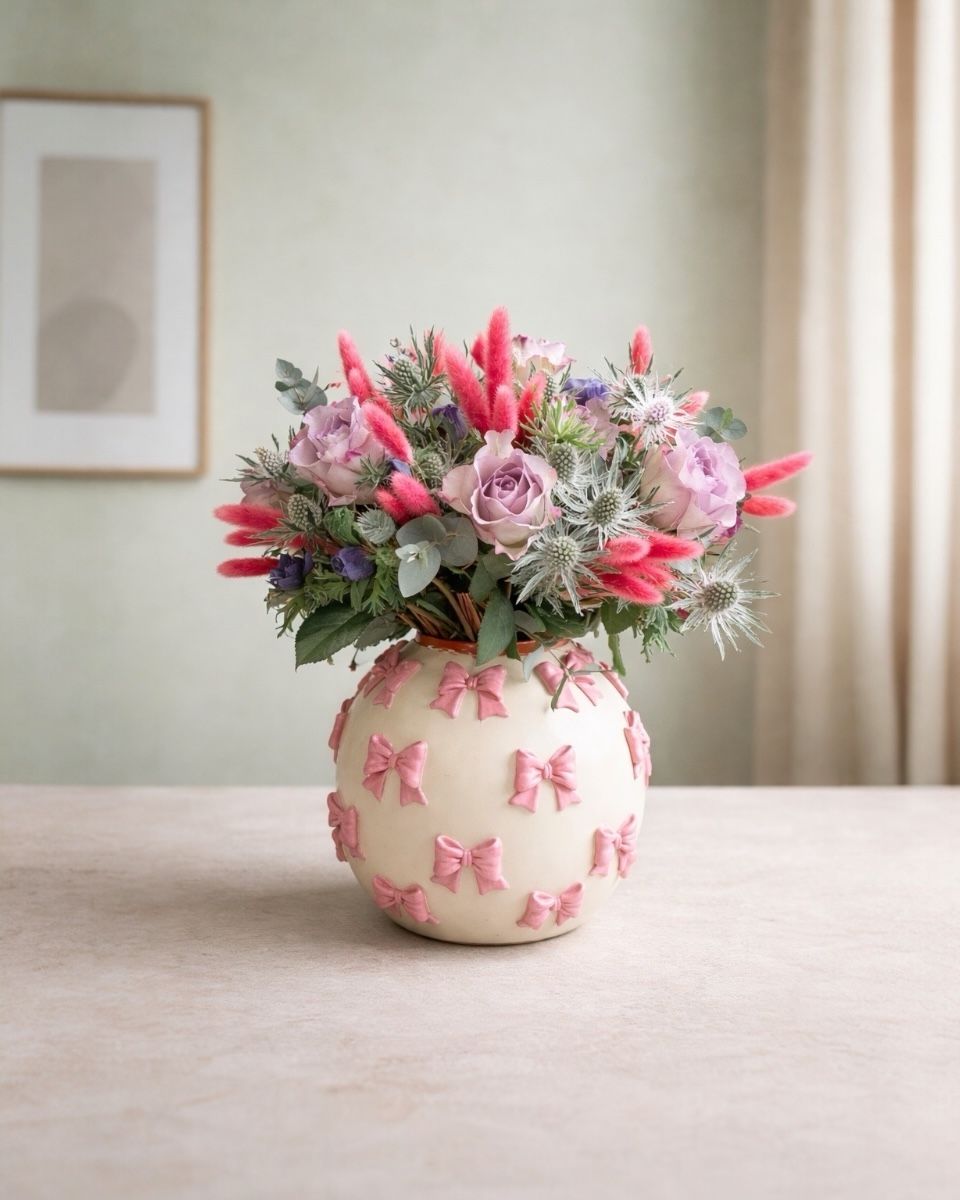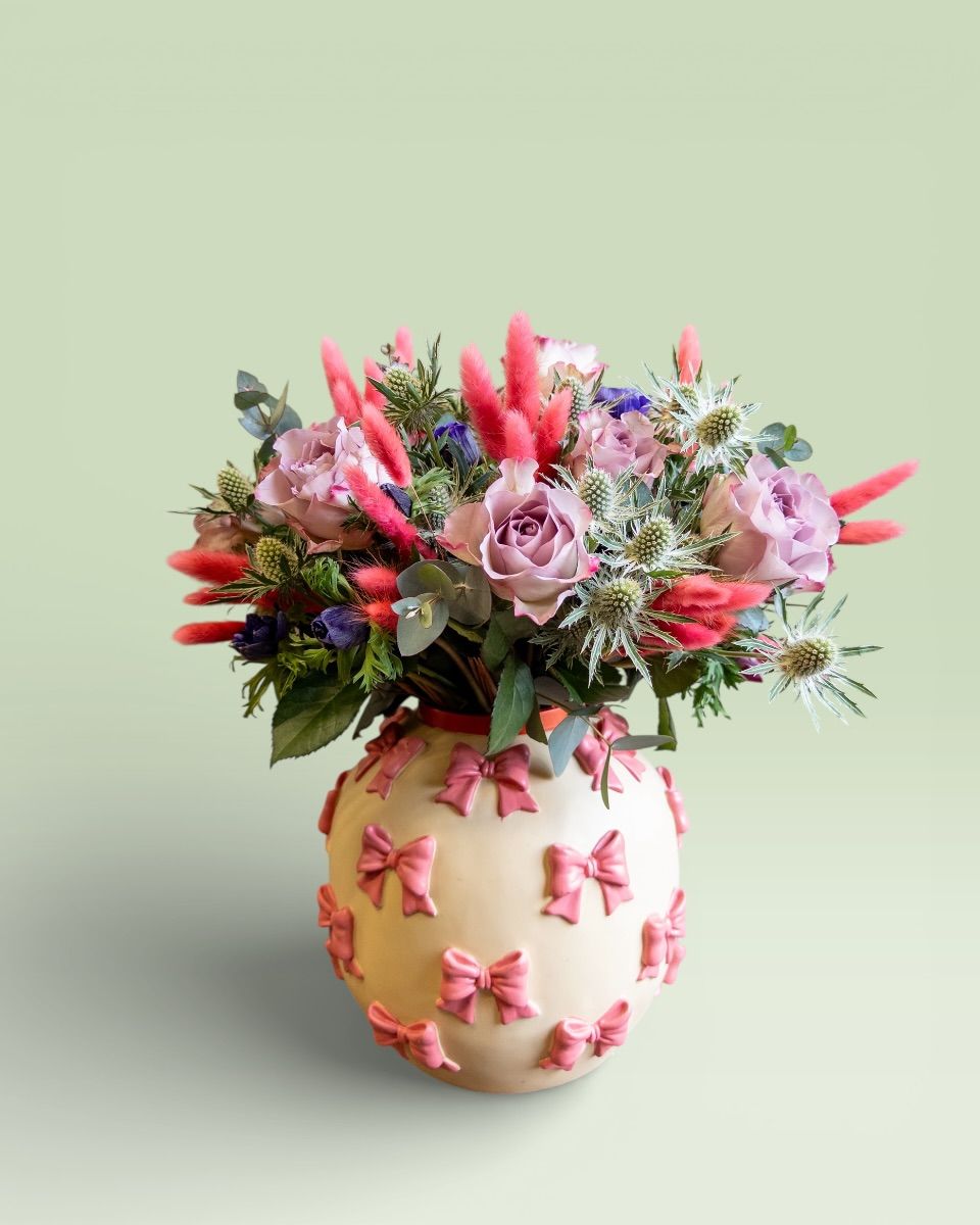Ένα ιδιαίτερα γλυκό δώρο για να καλωσορίσει το νέο μέλος της οικογένειας! Υπέροχα λιλά τριαντάφυλλα σε συνδυασμό με άλλα άνθη σε ένα μοναδικό βάζο με ροζ ανάγλυφους φιόγκους στο σχέδιό του.