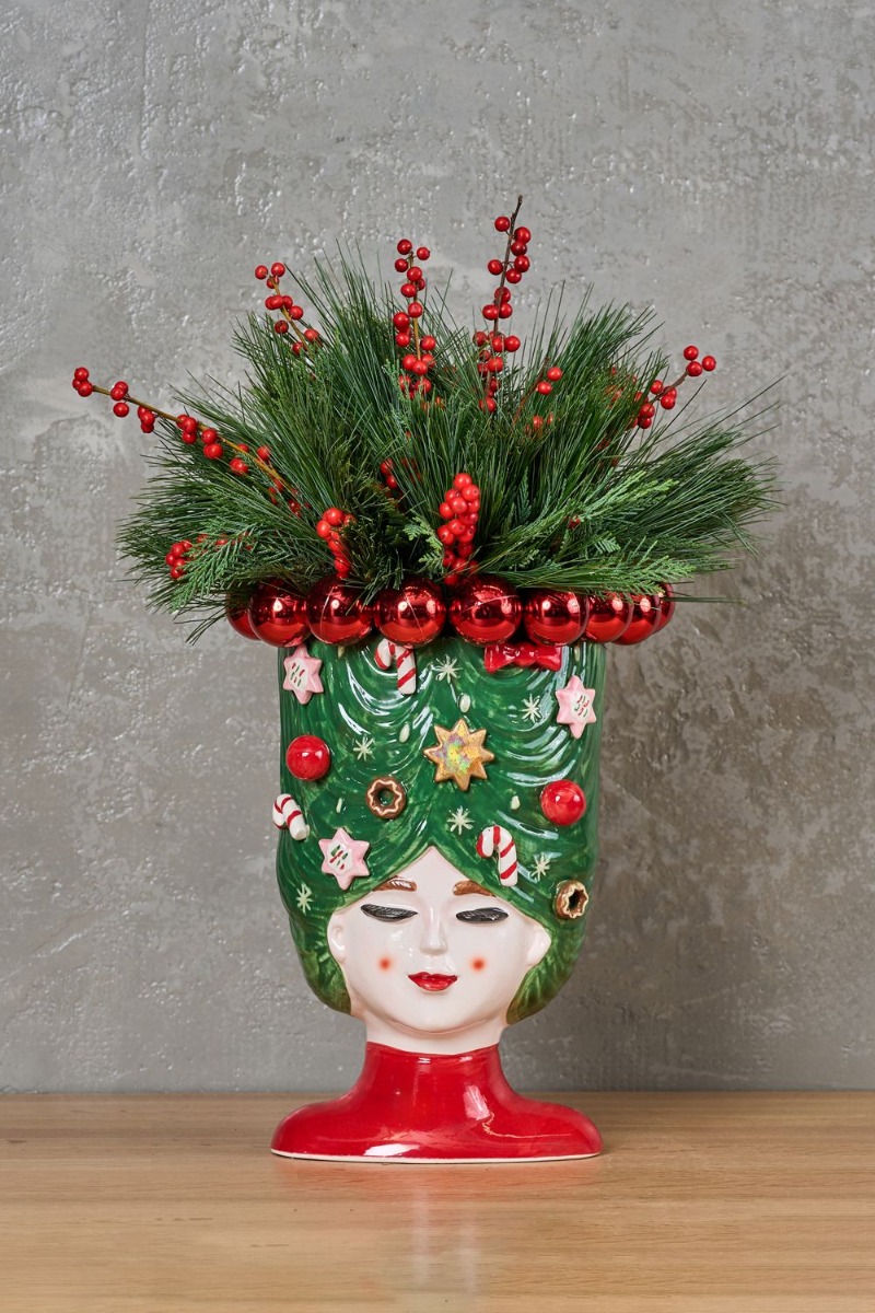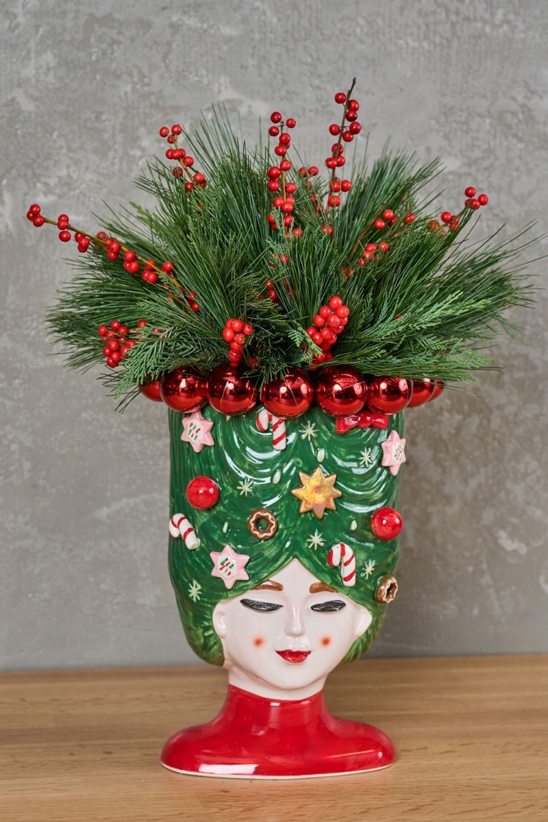 Ένα εντυπωσιακό χριστουγεννιάτικο βάζο με πεύκο, ίλεξ και κόκκινες μπάλες γύρω-γύρω. Διαστάσεις: Ύψος 50cm / Διάμετρος 30cm .