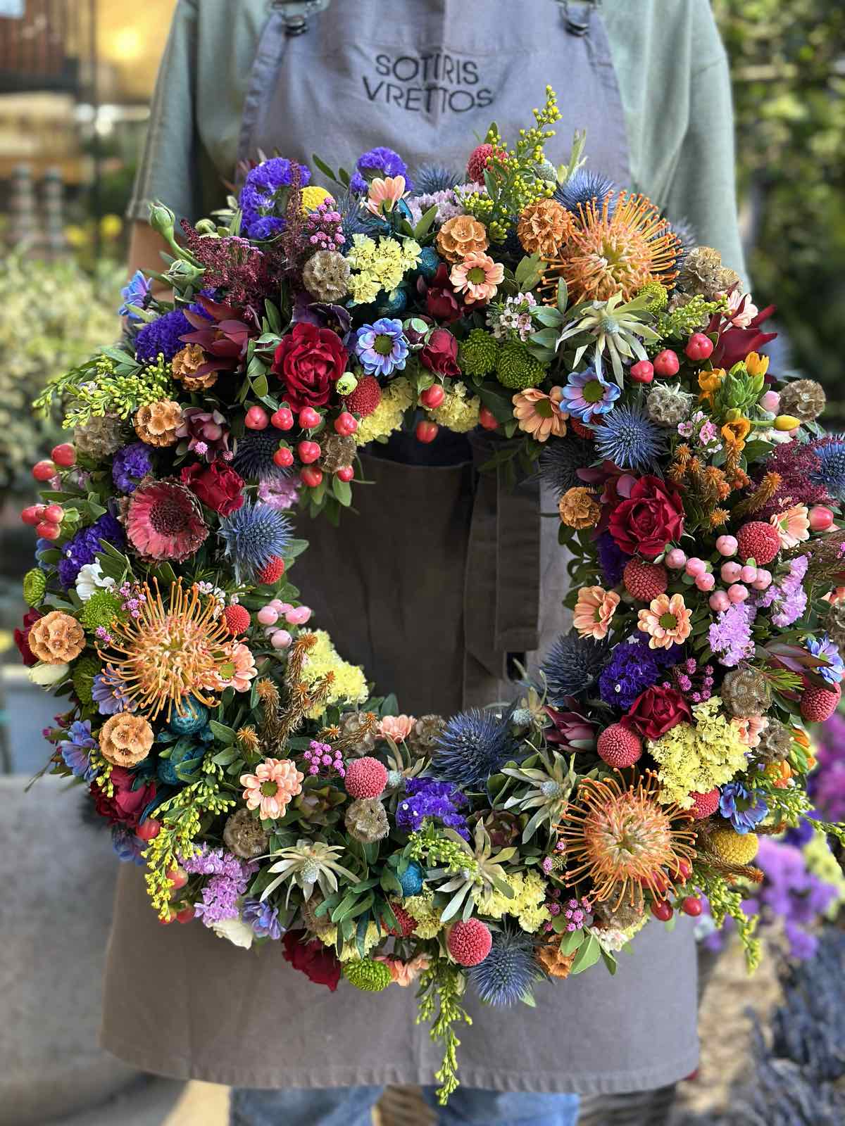 Πρωτομαγιάτικο πολύχρωμο στεφάνι από φρέσκα λουλούδια εποχής. Διάμετρος: 40cm-50cm-60cm