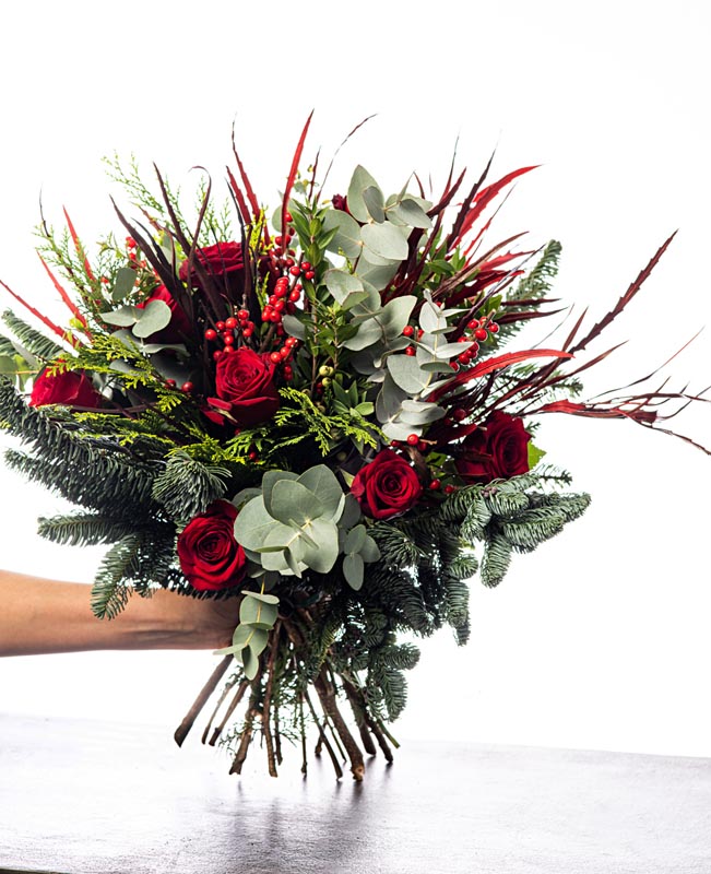 Ένα Χριστουγεννιάτικο μπουκέτο από κόκκινα τριαντάφυλλα, έλατο, πεύκο, κουκουνάρια, ευκάλυπτο και διάφορα άλλα λουλούδια εποχής.