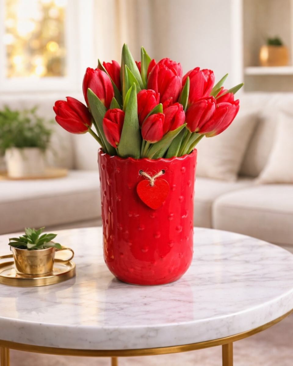 Κόκκινες τουλίπες, σύμβολο αληθινής αγάπης και πάθους, τοποθετημένες σε κομψό κόκκινο κεραμικό κασπώ με διακριτική καρδιά.