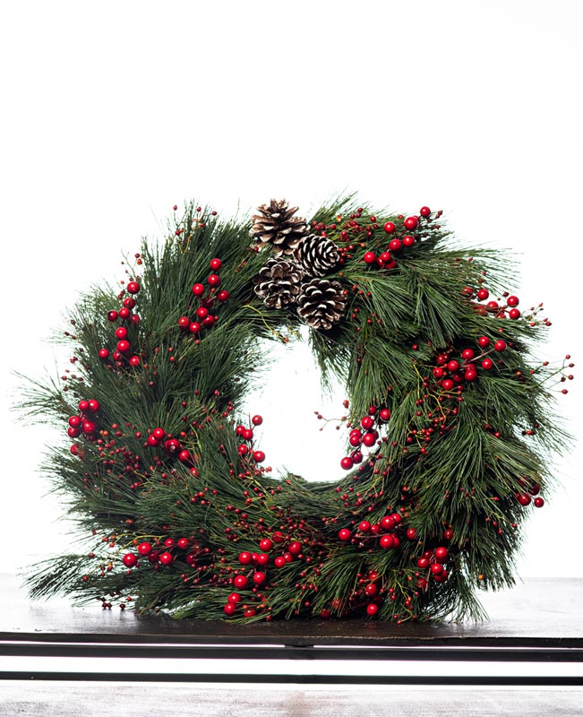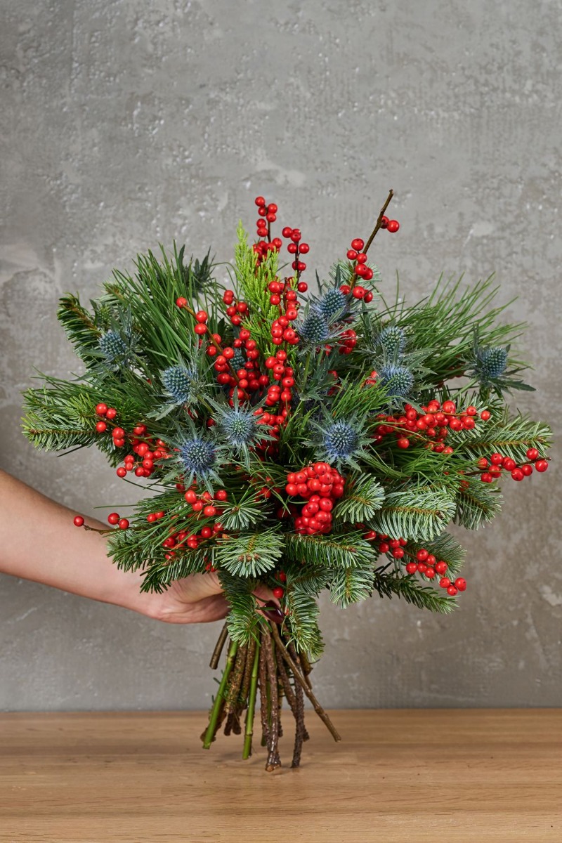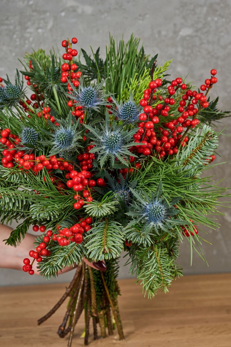 Ένα μπουκέτο από έλατο, πεύκο, ερίγκιουμ και ίλεξ. Διαστάσεις: Ύψος 45cm / Διάμετρος 30cm